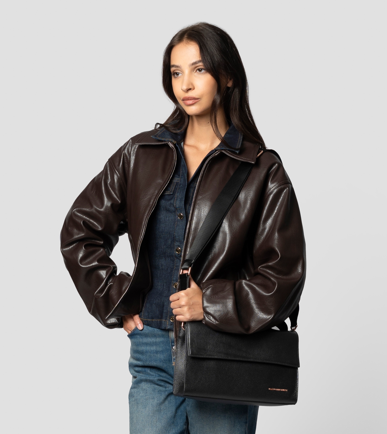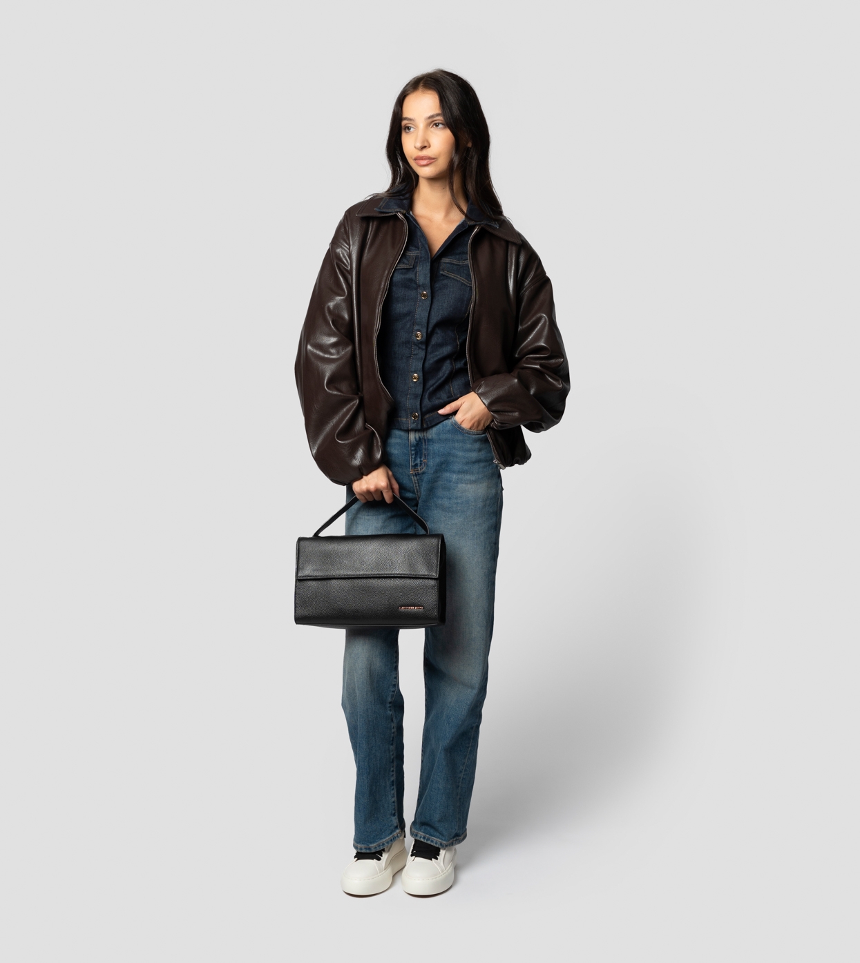 With its rigid silhouette and minimalist front flap, HOLLY is a shoulder bag that combines structure and femininity. Equipped with a removable shoulder strap, it adapts elegantly to every moment of the day, from business looks to aperitifs in the city.