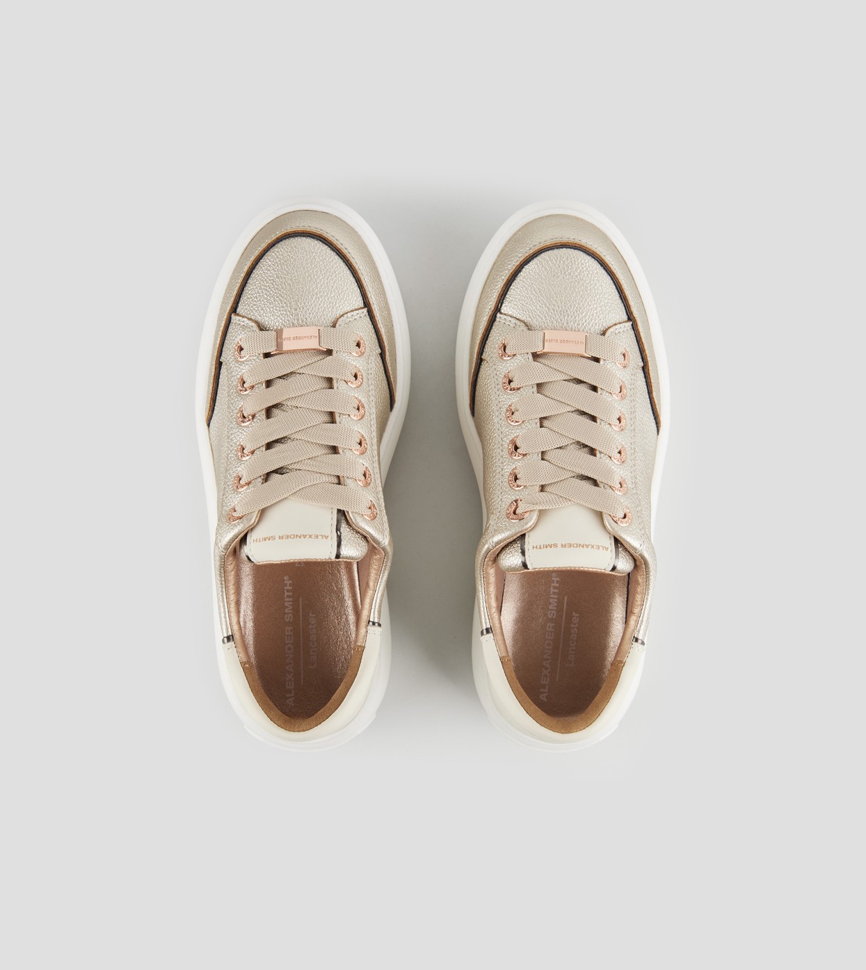 Il modello prende il nome da Lancaster Gate, zona del centro di Londra adiacente ai Kensington Gardens: un’area residenziale in cui lo stile classico e barocco delle abitazioni si fonde con i resti di una chiesa Gotica del 1800. Con lo stesso perfetto mix di stili, la Lancaster di Alexander Smith è un match tra i dettagli preziosi e ricercati della tomaia e degli occhielli, con l’audacia e l’importanza della suola, per uno stile che combina eleganza e unicità, in perfetta sintonia con l’anima del brand, in questa variante in pelle bottalata laminata oro e tallone bianco.