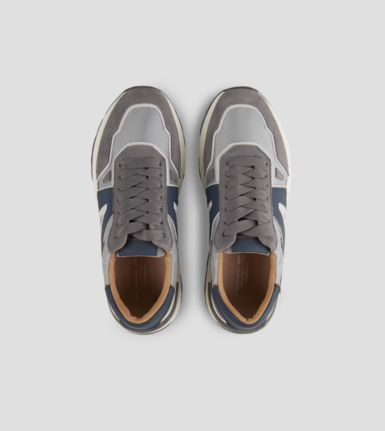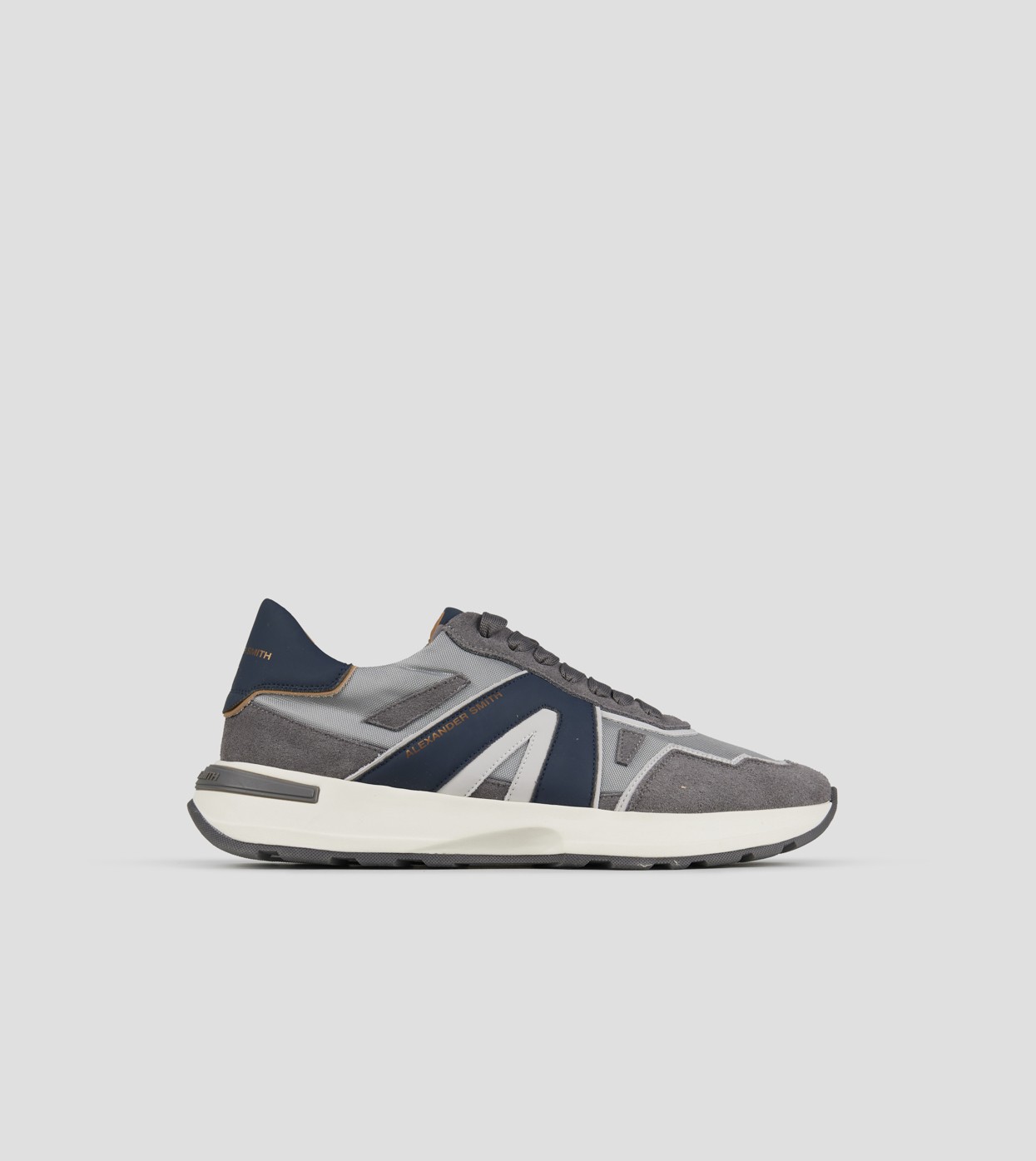 Il nuovo modello firmato Alexander Smith, che prende ispirazione da una delle città più iconiche del Regno Unito, è la nuova proposta running del brand: linea affusolata, suola importante e dettagli ricercati danno vita ad una sneakers versatile e distintiva, in questa variante in suede grigio, nylon e cordura in tinta, con logo laterale e tallone blu.