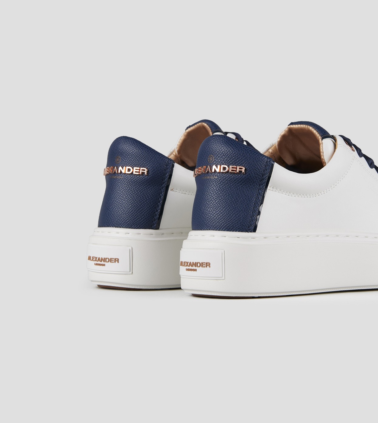 Ispirata allo stile dinamico e sofisticato della capitale britannica, London è la sneaker firmata Alexander London che unisce design contemporaneo e comfort quotidiano. Realizzata con materiali premium e finiture curate nei minimi dettagli, London è pensata per chi vive la città con stile, tra incontri di lavoro e momenti di relax. Un classico urbano rivisitato, perfetto per distinguersi con discrezione, in questa versione con suola alta in pelle liscia bianca e tallone in pelle palmellata blu.
