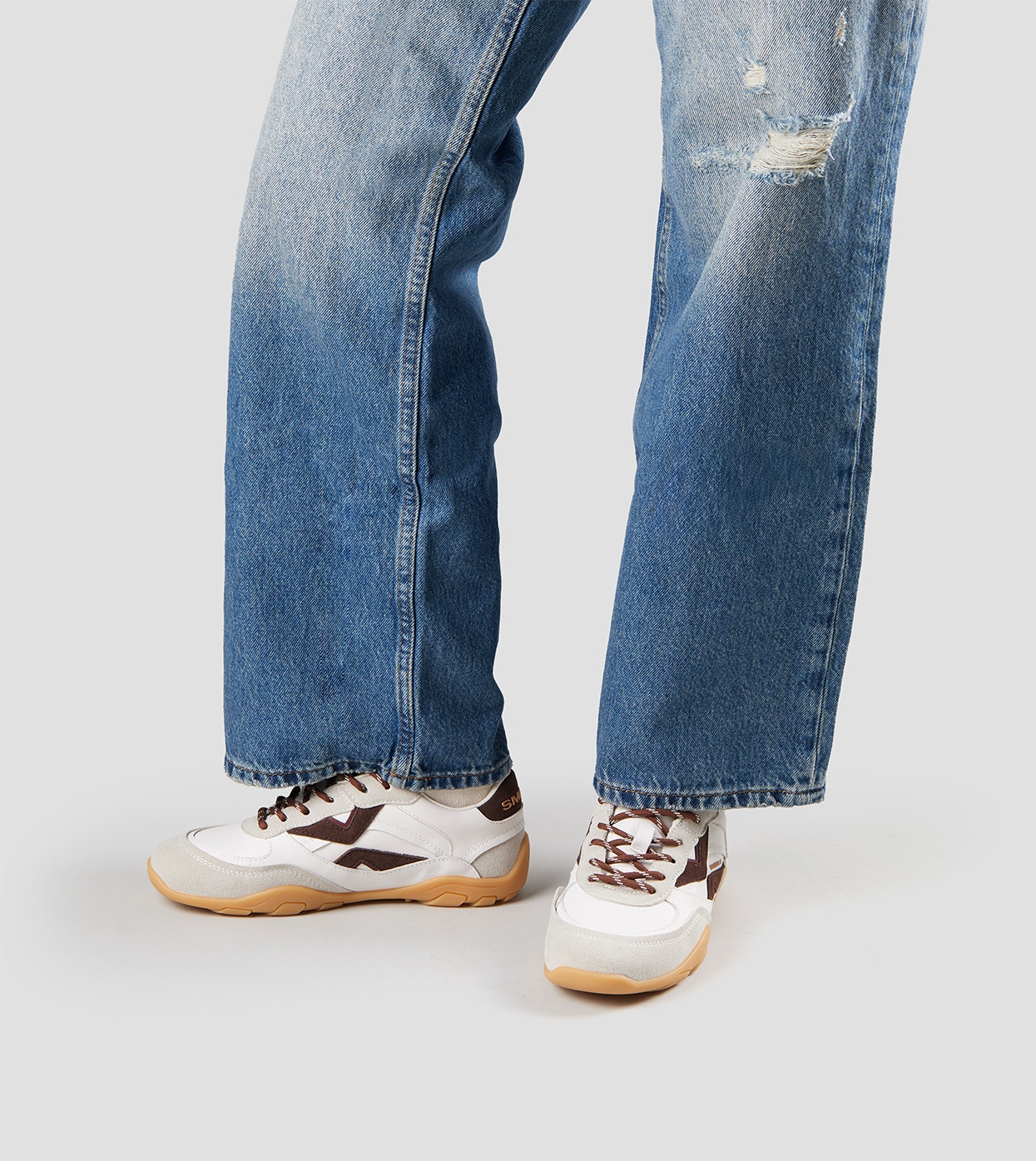 Mist Donna in bianco con dettagli in suede grigio, tallone e logo laterale in suede marrone