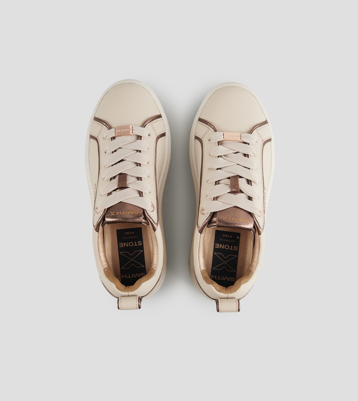 Pulita, lineare, intramontabile. STONE è la sneaker minimal firmata Smith X, che unisce spirito urbano e gusto raffinato in un design unisex pensato per durare nel tempo, in questa variante in avorio scuro con dettagli in laminato bronzo.