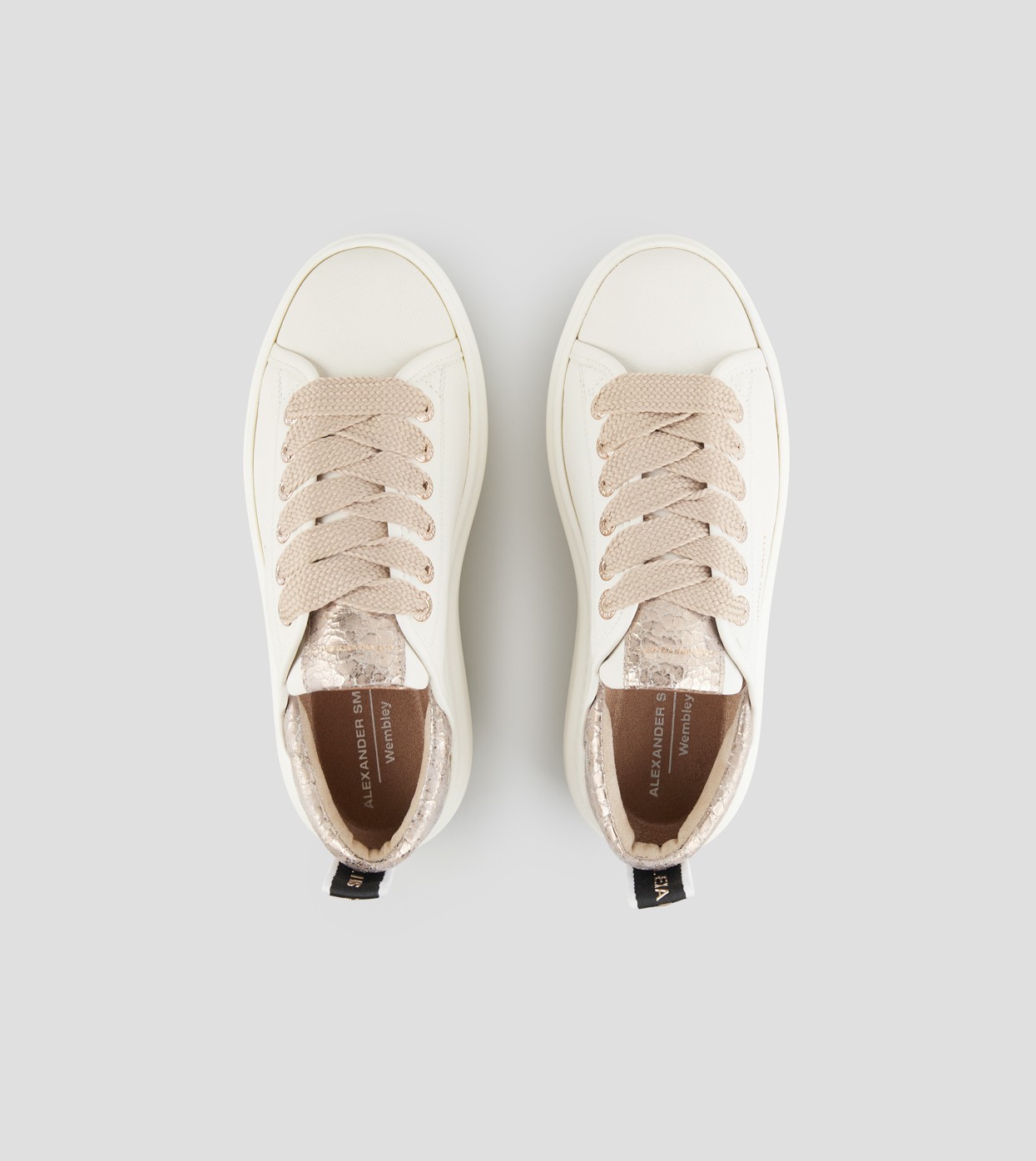 L'iconica Wembley evolve in questa variante con suola più alta, mantenendo lo stile e il design del modello originale, con un tocco di audacia in più, in questa variante in pelle bianca e tallone in pelle cracklè laminata beige.