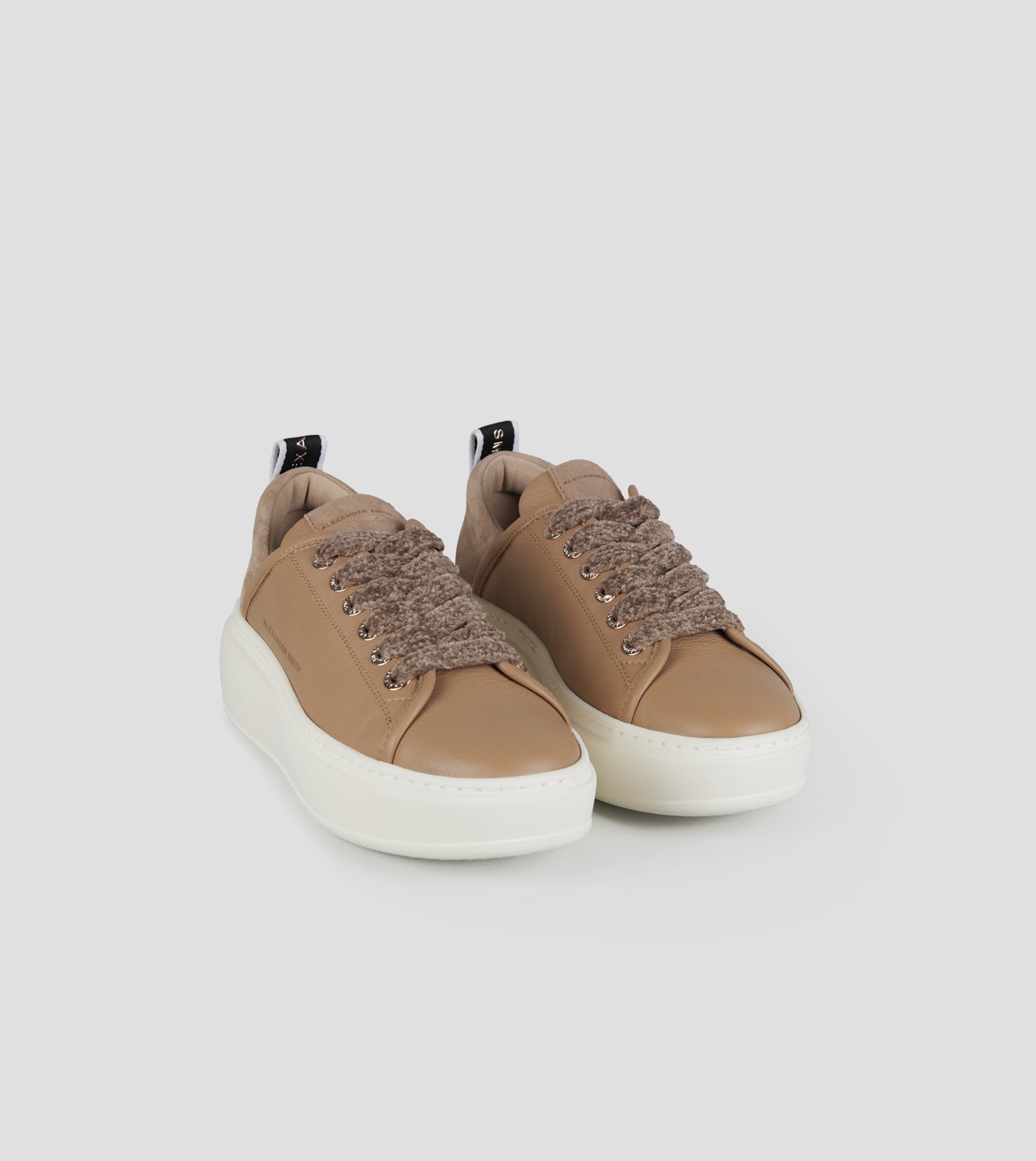 L'iconica Wembley evolve in questa variante con suola più alta, mantenendo lo stile e il design del modello originale, con un tocco di audacia in più, in questa variante in morbida pelle beige scuro e suede.