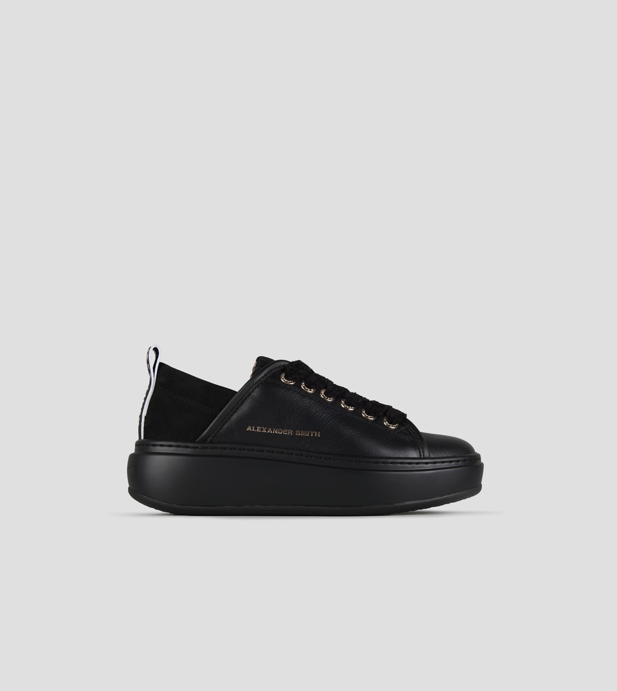 L'iconica Wembley evolve in questa variante con suola più alta, mantenendo lo stile e il design del modello originale, con un tocco di audacia in più, in questa variante in pelle nera e suola nera.