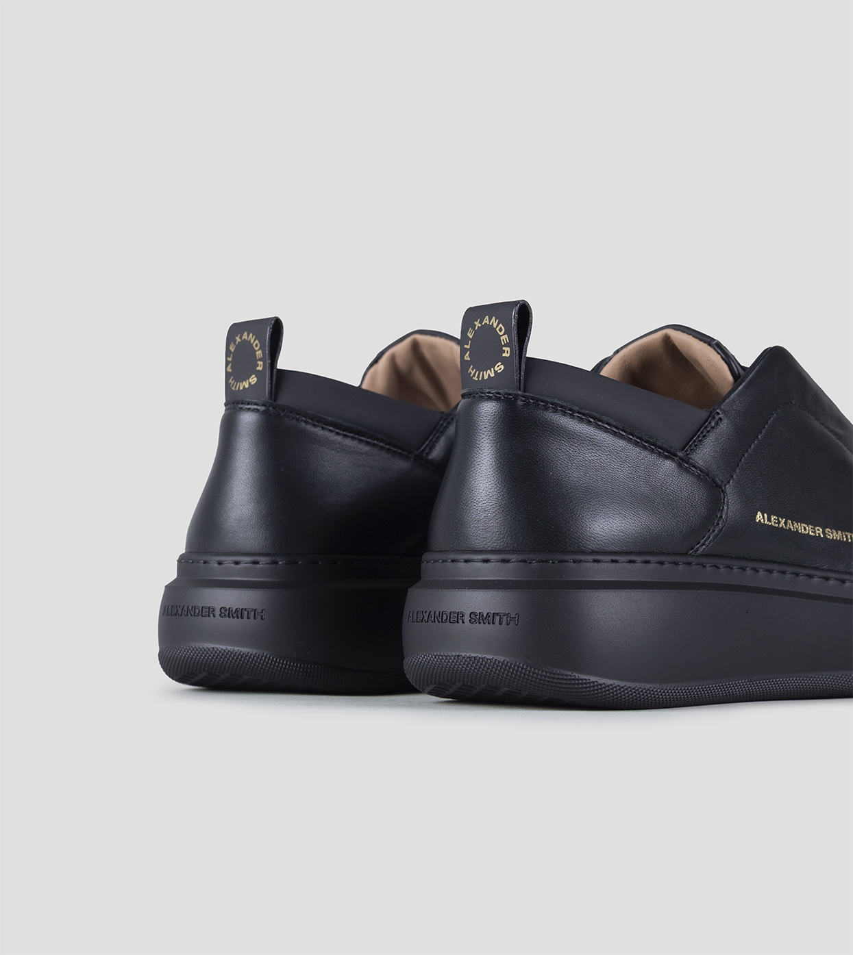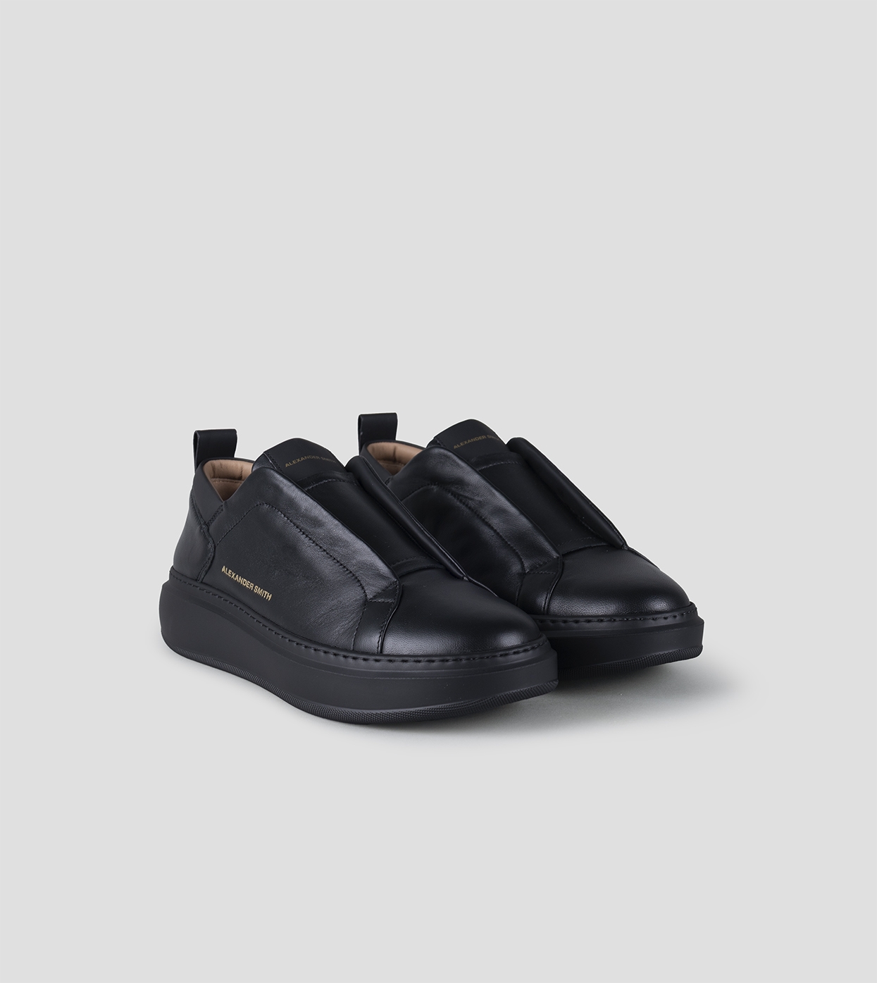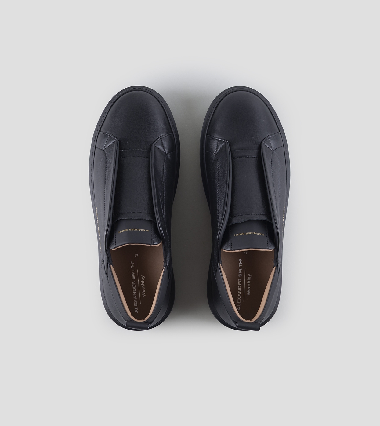 L'iconica Wembley evolve in questa variante slip-on, che mantiene lo stile e il design del modello originale, con la freschezza di una nuova interpretazione senza lacci, in questa variante in morbida pelle nera con suola nera.