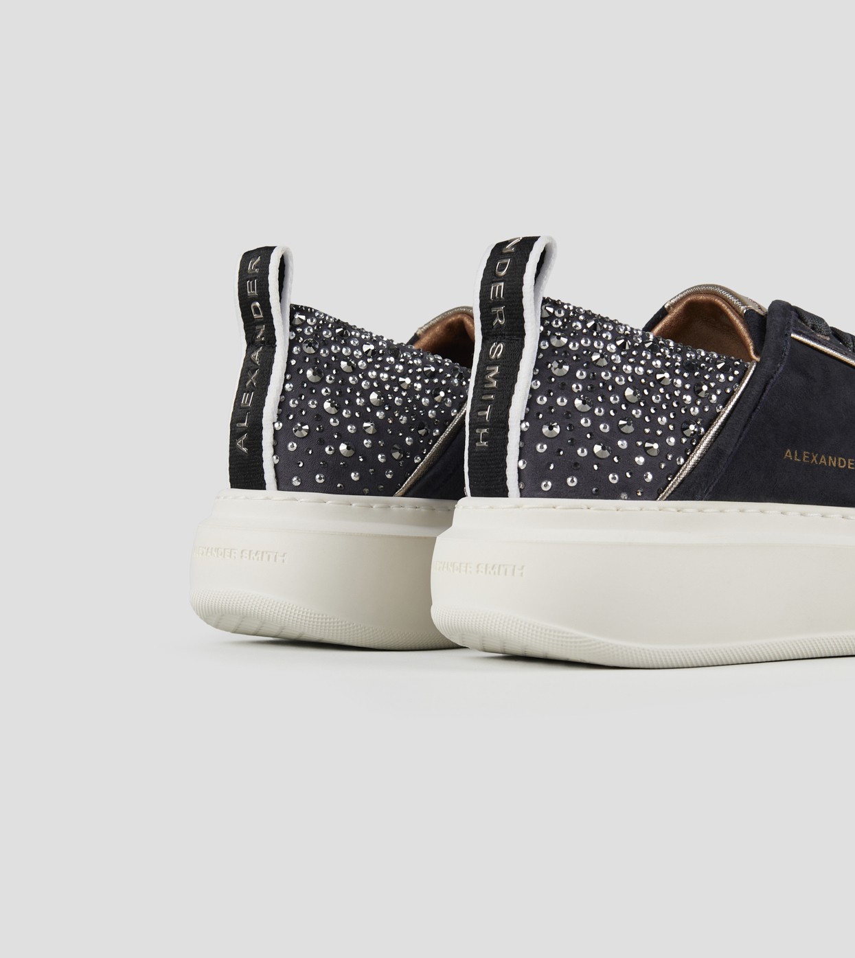 Il riferimento al famoso stadio inglese è chiaro: sportività ed eleganza si fondono per dare vita a questo modello. Le Wembley rappresentano l’equilibrio tra comodità, stile e sobrietà, ai quali si aggiunge modernità grazie ai dettagli unici che fanno la differenza, in questa versione in suede grigio scuro e tallone con strass.