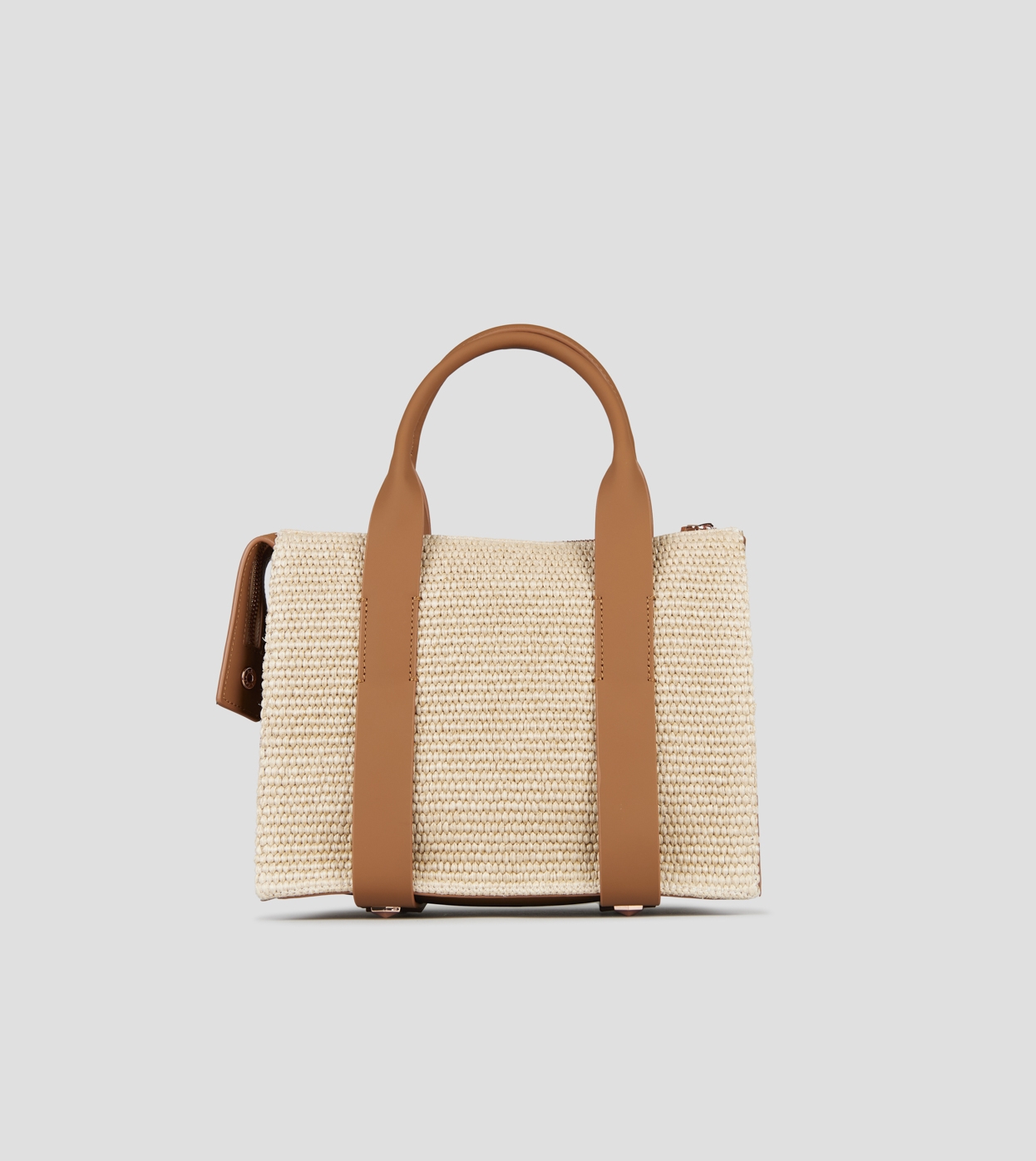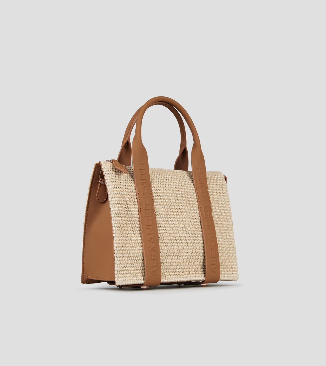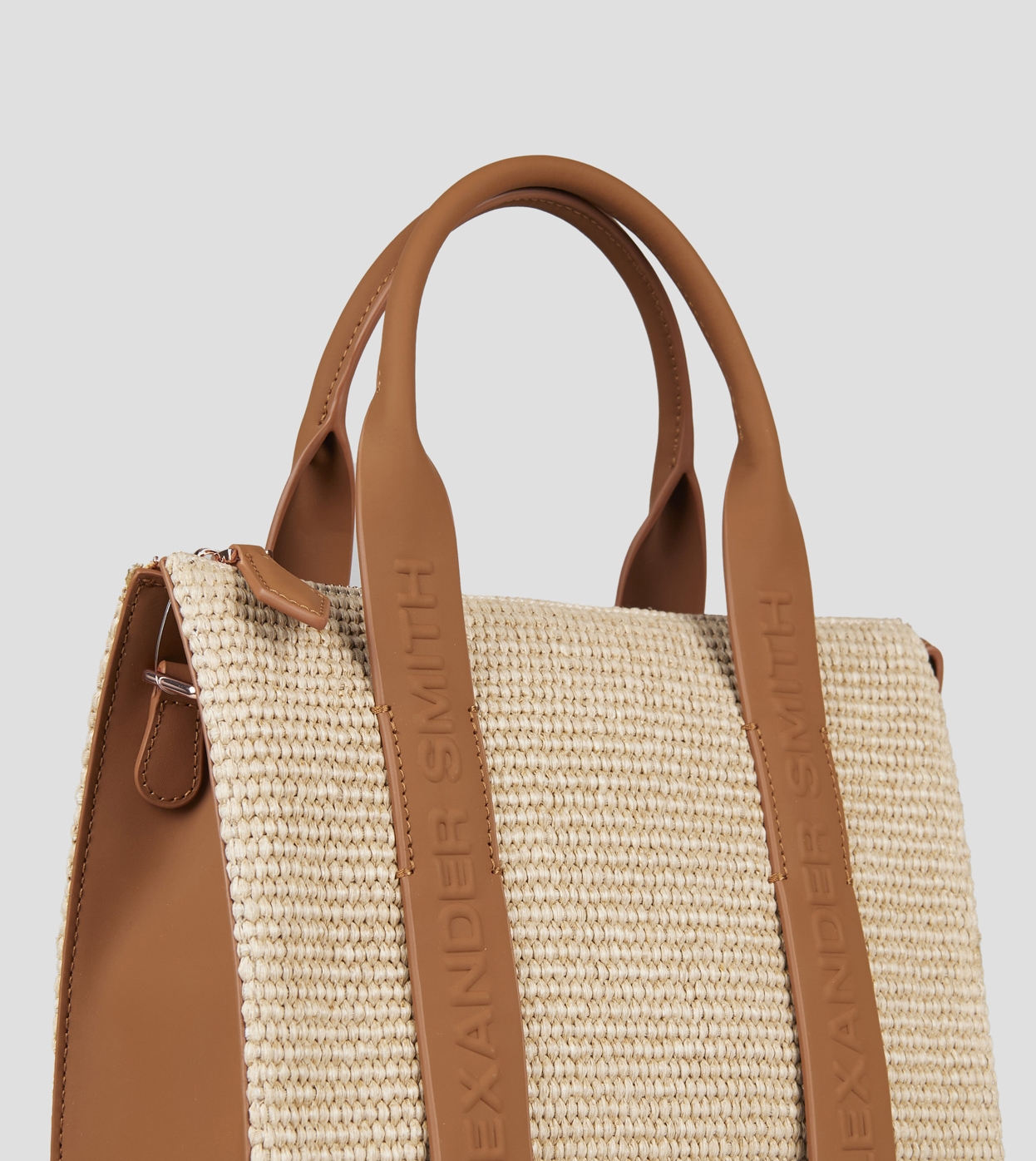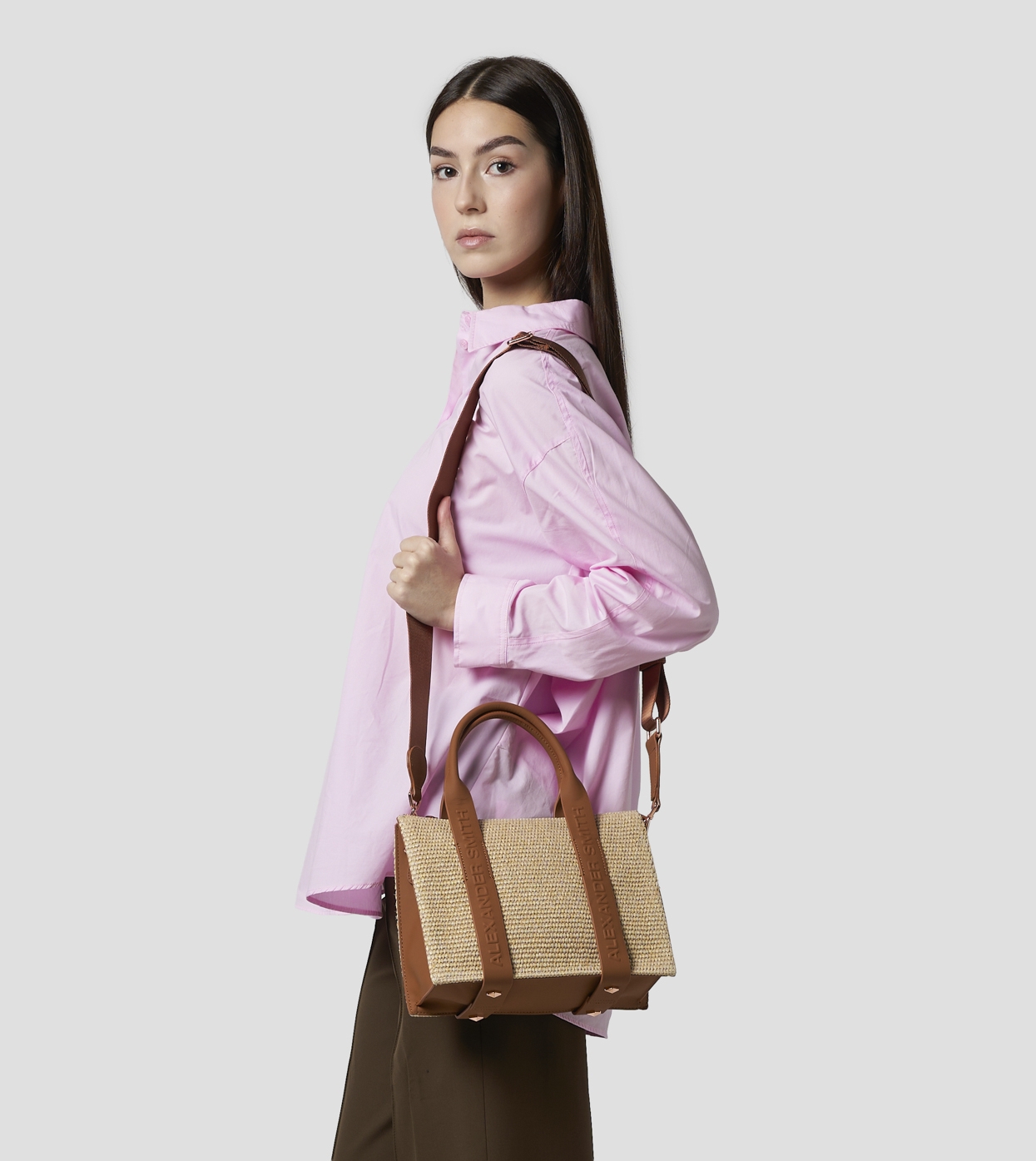 Jane Small handbag with shoulder strap in beige rafia and brown handle