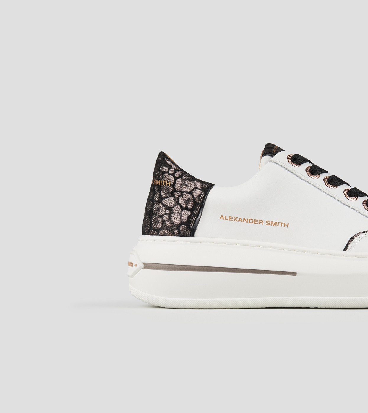 Lancaster Woman in white leather and spotted laminated bronze heel