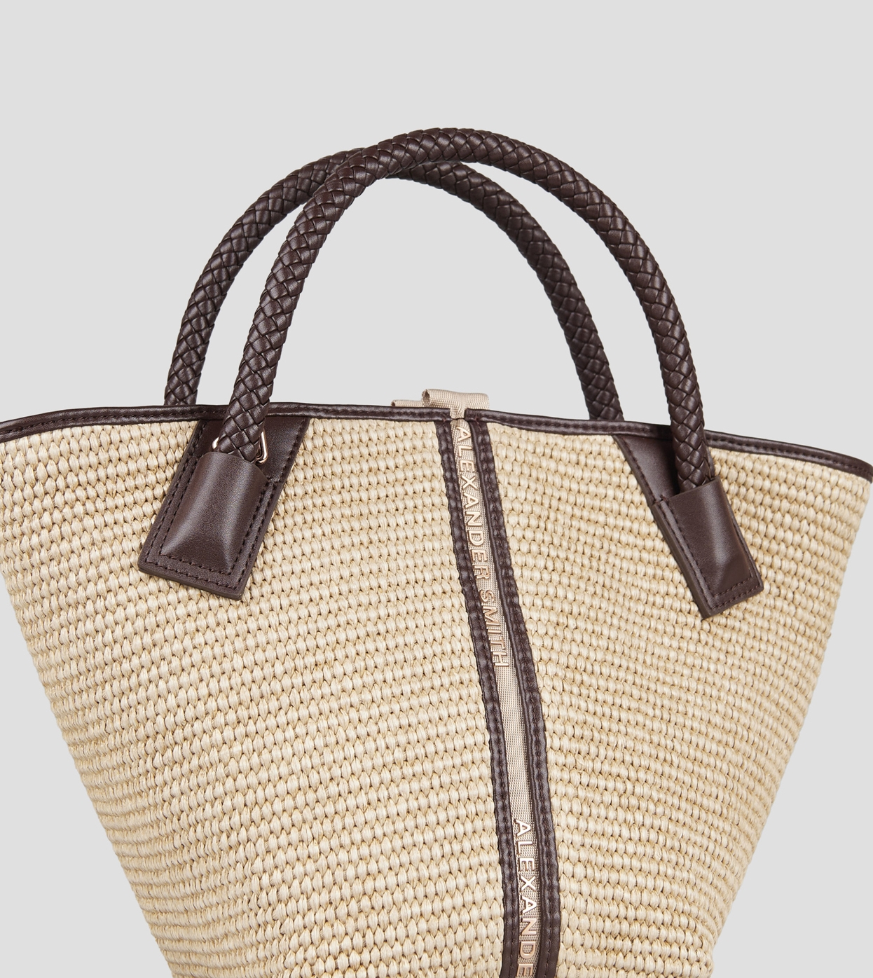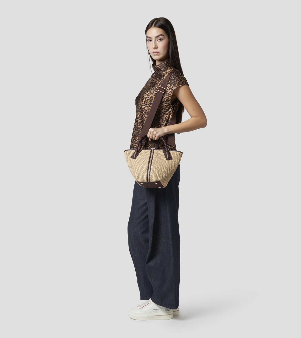 Lauren Small handbag with shoulder strap in beige raffia and woven brown handle
