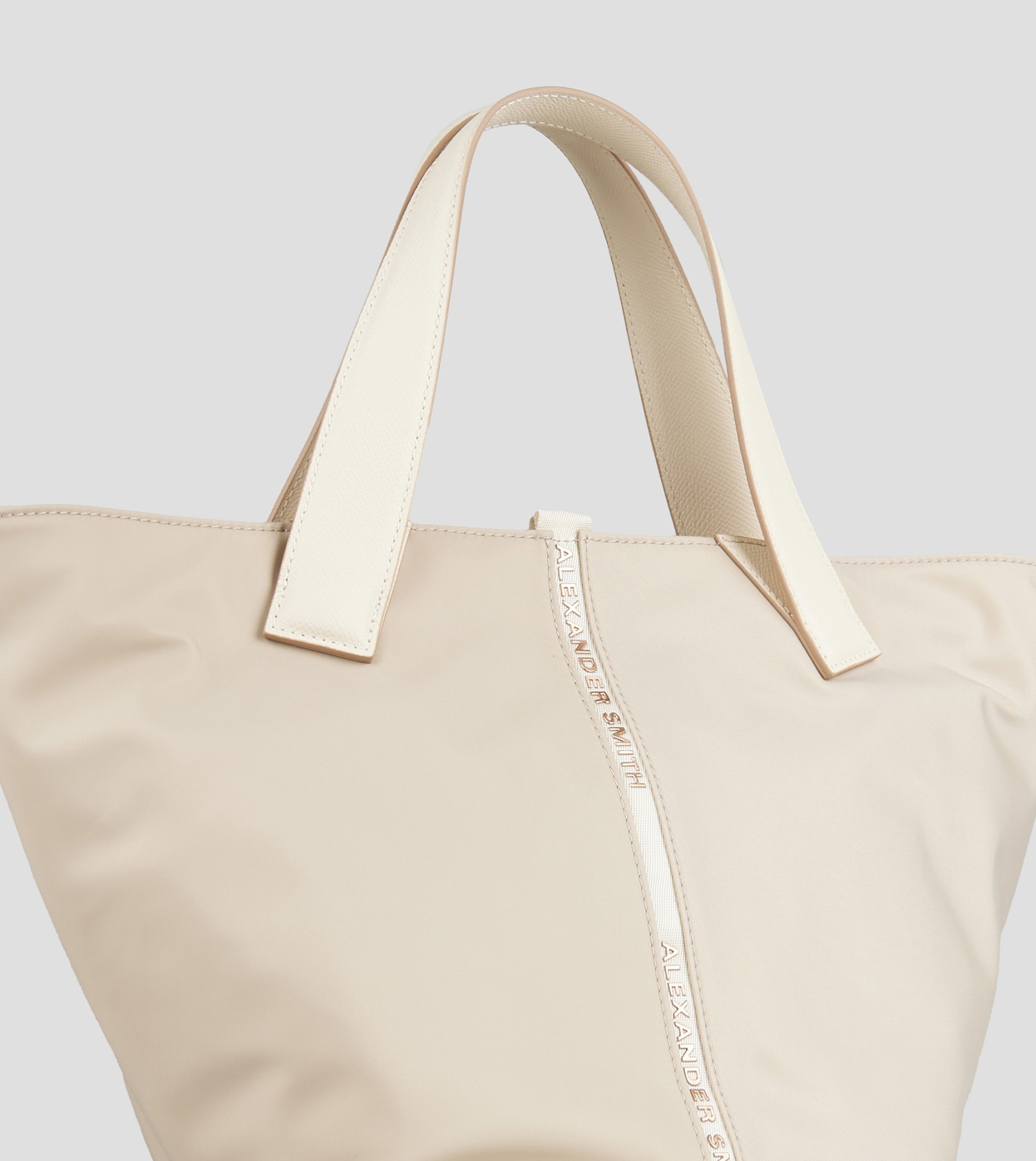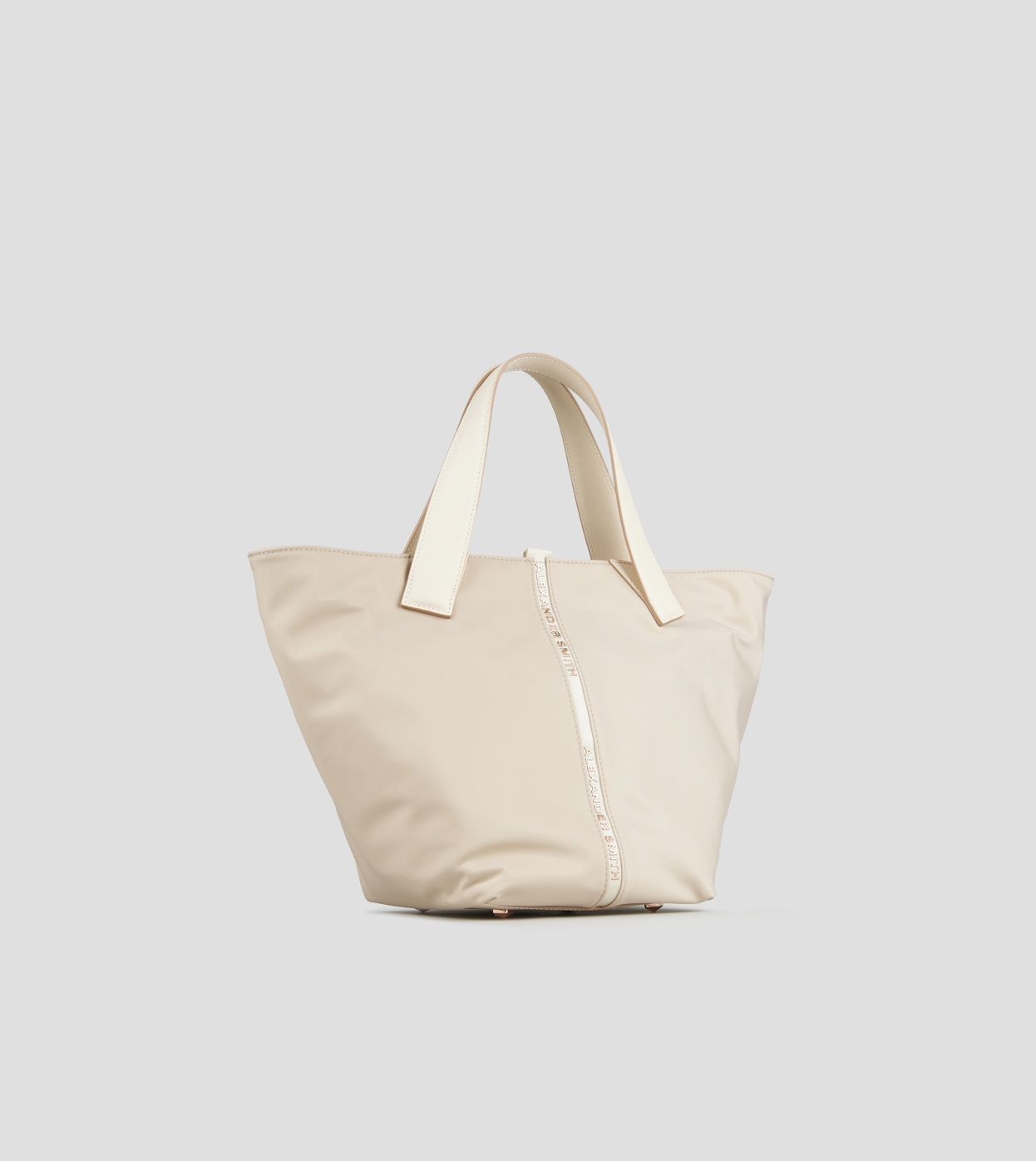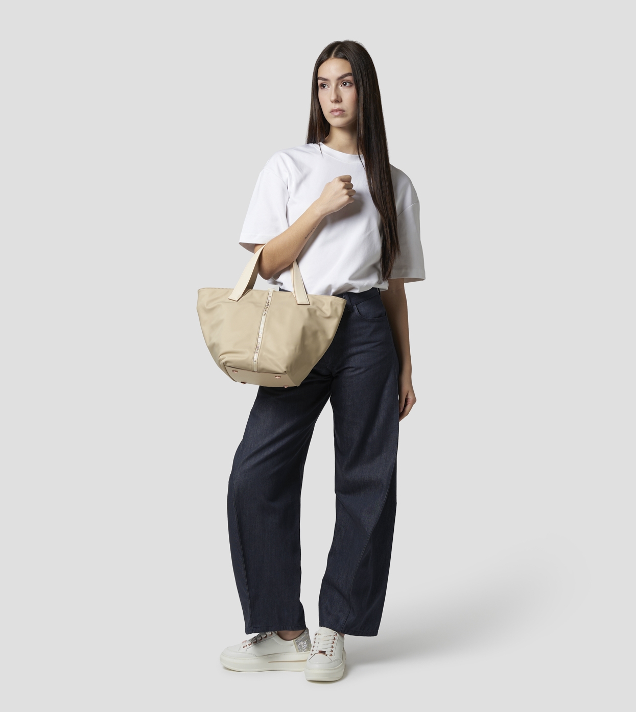 LAUREN is a shopper bag that combines functionality and style in a contemporary and bold design. The geometric lines and central logo detail define a strong yet versatile character, perfect for completing any look with a modern touch.