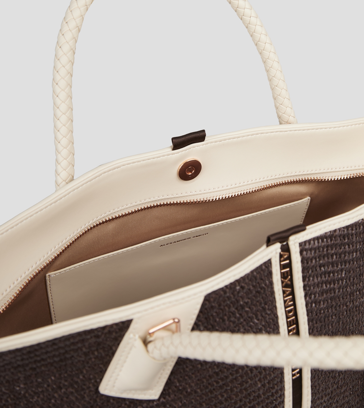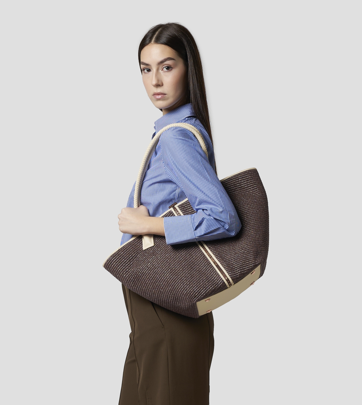 LAUREN is a shopper bag that combines functionality and style in a contemporary and bold design. The geometric lines and central logo detail define a strong yet versatile character, perfect for completing any look with a modern touch.