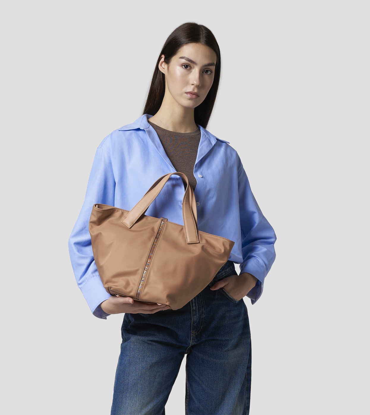 LAUREN is a shopper bag that combines functionality and style in a contemporary and bold design. The geometric lines and central logo detail define a strong yet versatile character, perfect for completing any look with a modern touch.