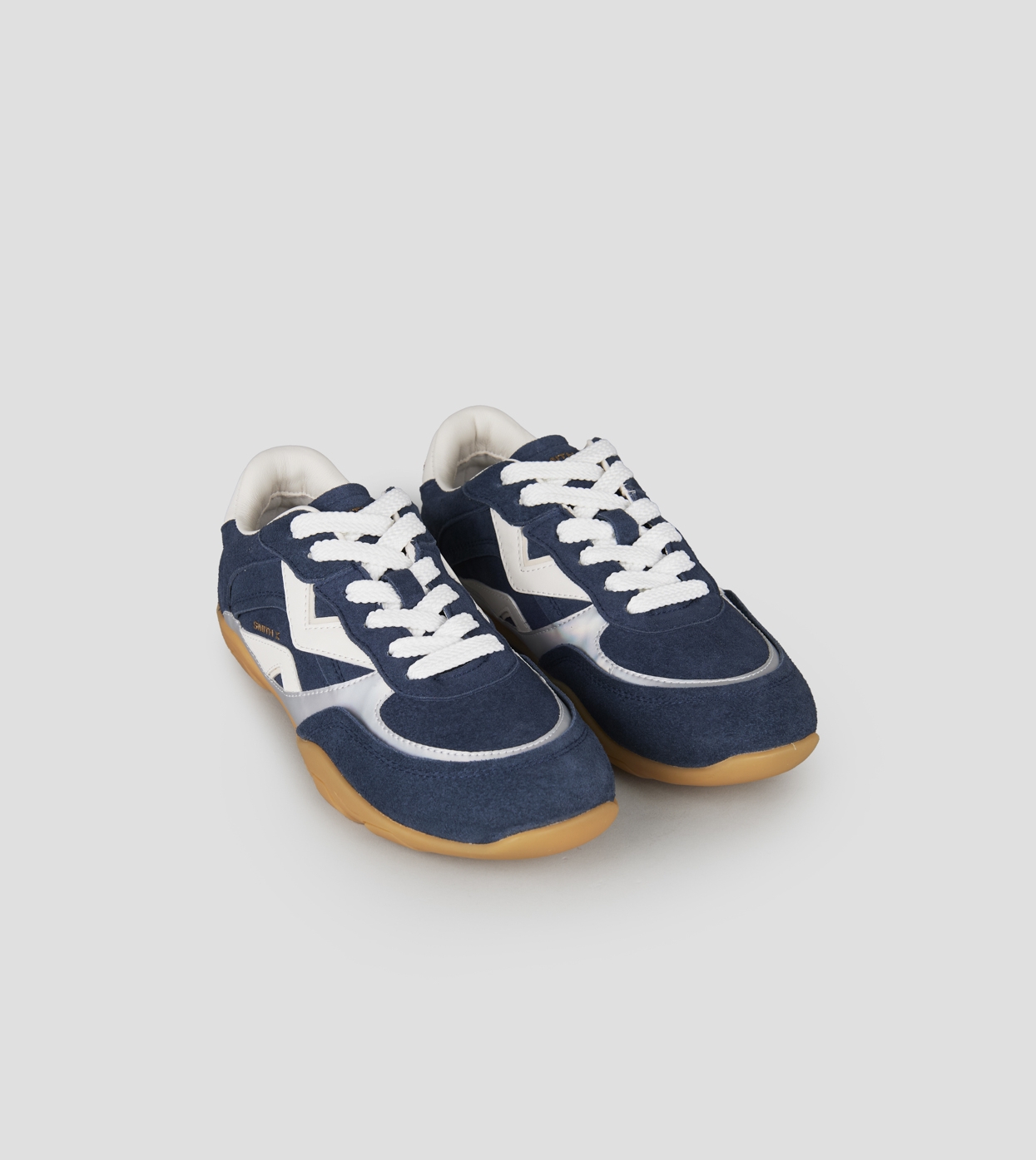 Mist Woman in blue with suede and laminate inserts, white heel and logo