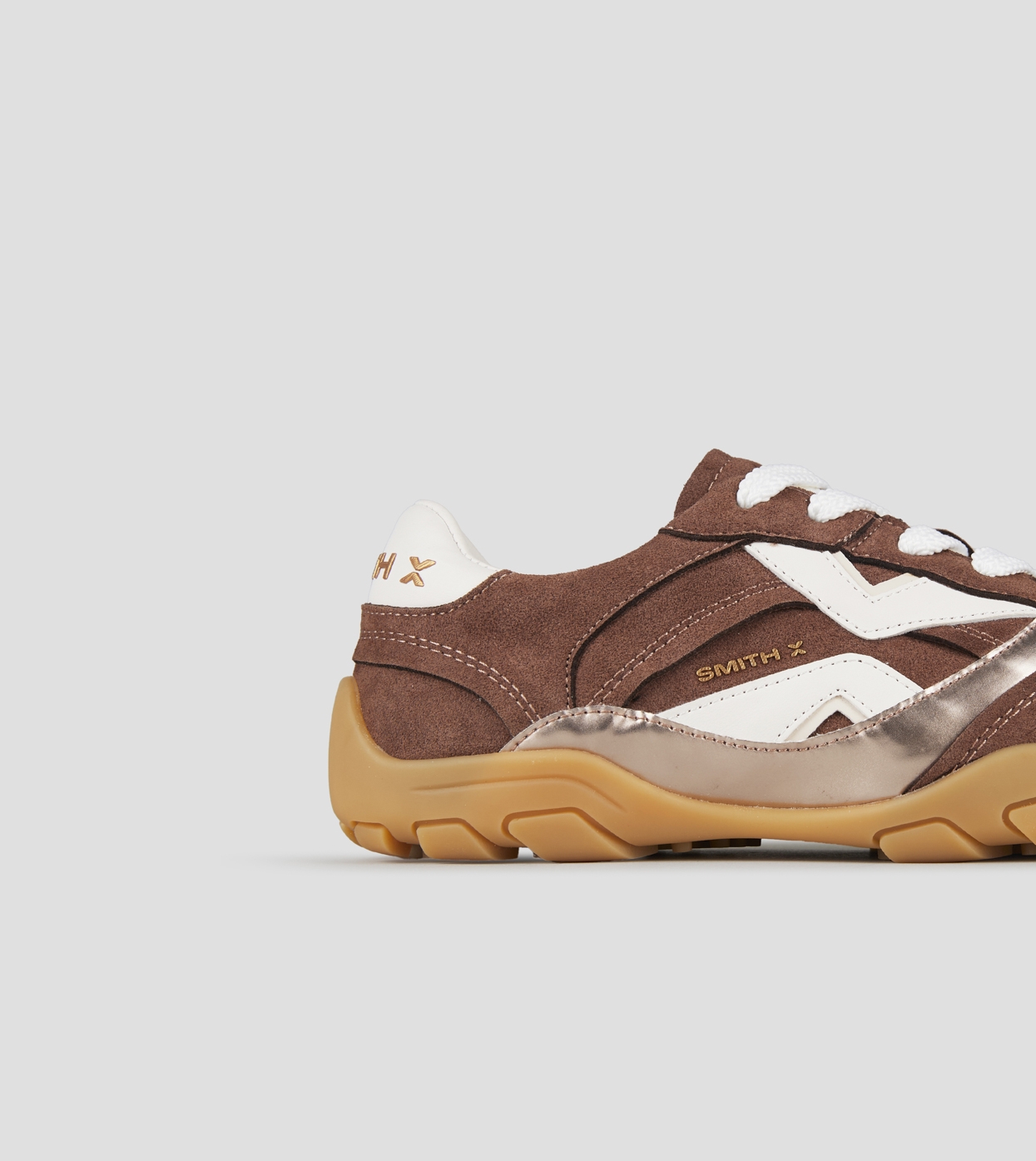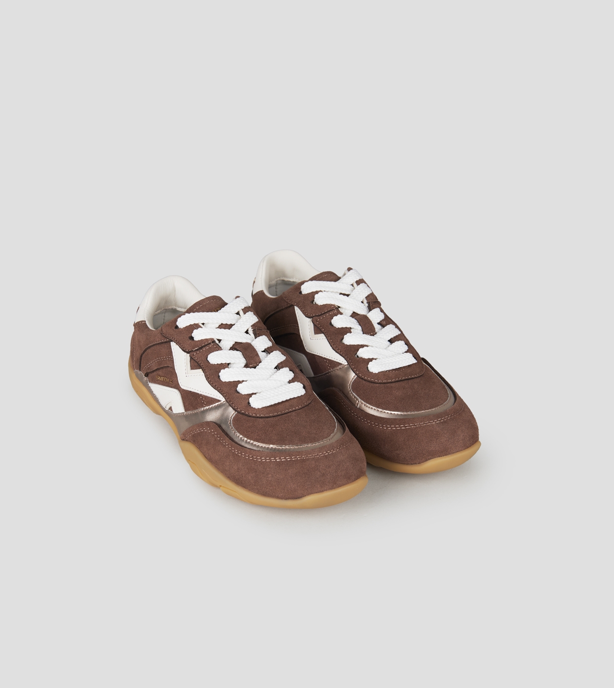 Mist Woman in brown with suede and laminate inserts, white heel and logo