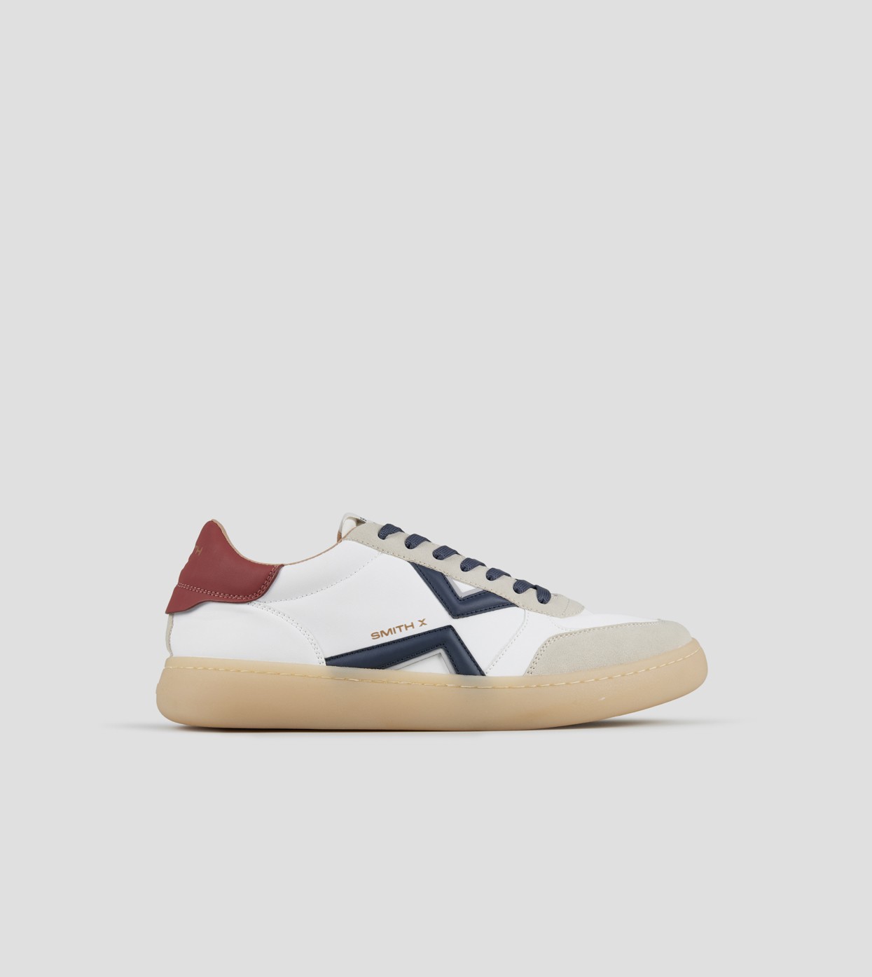 Ocean Man in white and grey suede details with blue side logo and red heel