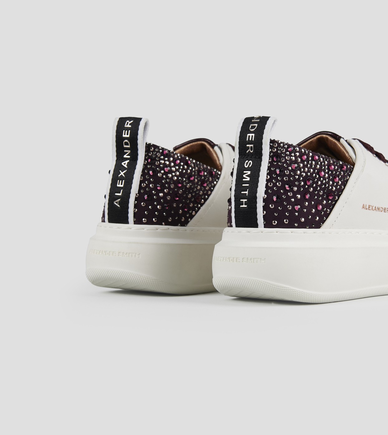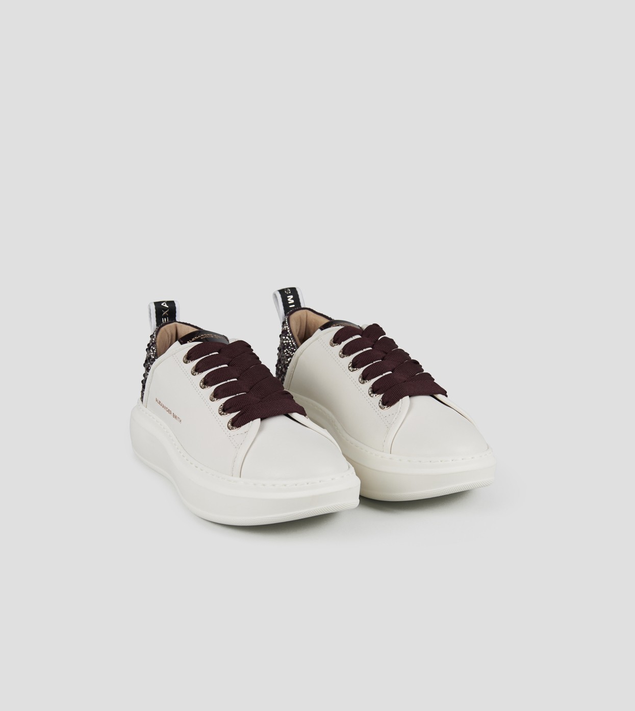 Wembley Woman in white leather and rhinestones bordeaux heel