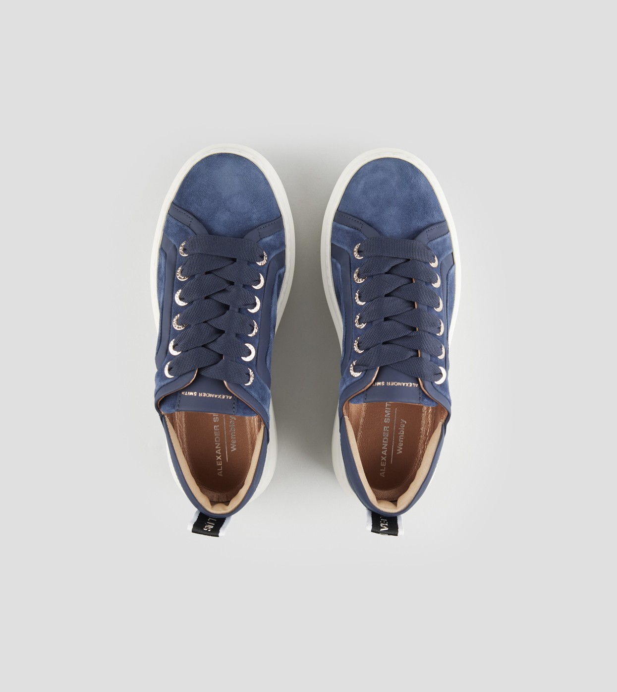 Wembley Woman in blue suede with leather side ribbing and heel